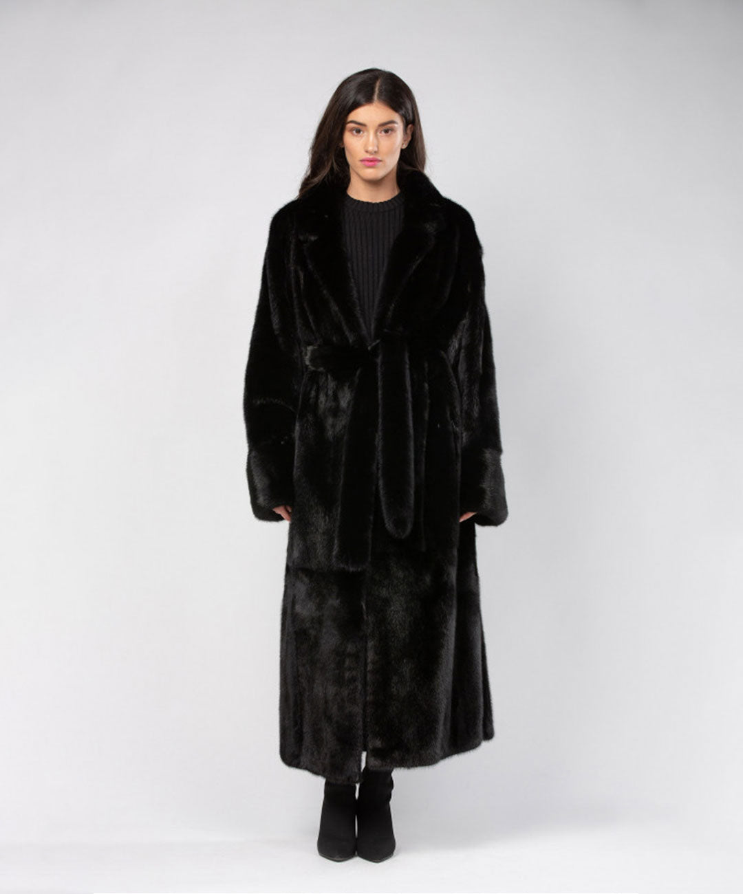 Hüllen Sie sich in Luxus mit unserem langen schwarzen Nerzmantel für Damen, einem zeitlosen Meisterwerk.