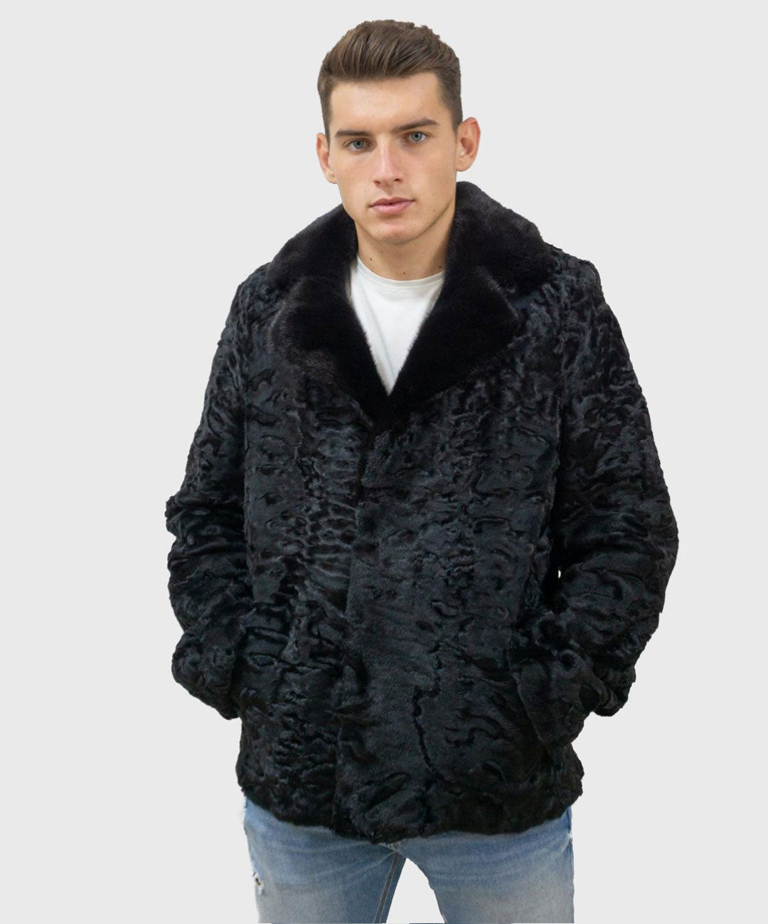 Schwarze Astrachan-Pelzjacke für Herren mit Nerzpelzkragen