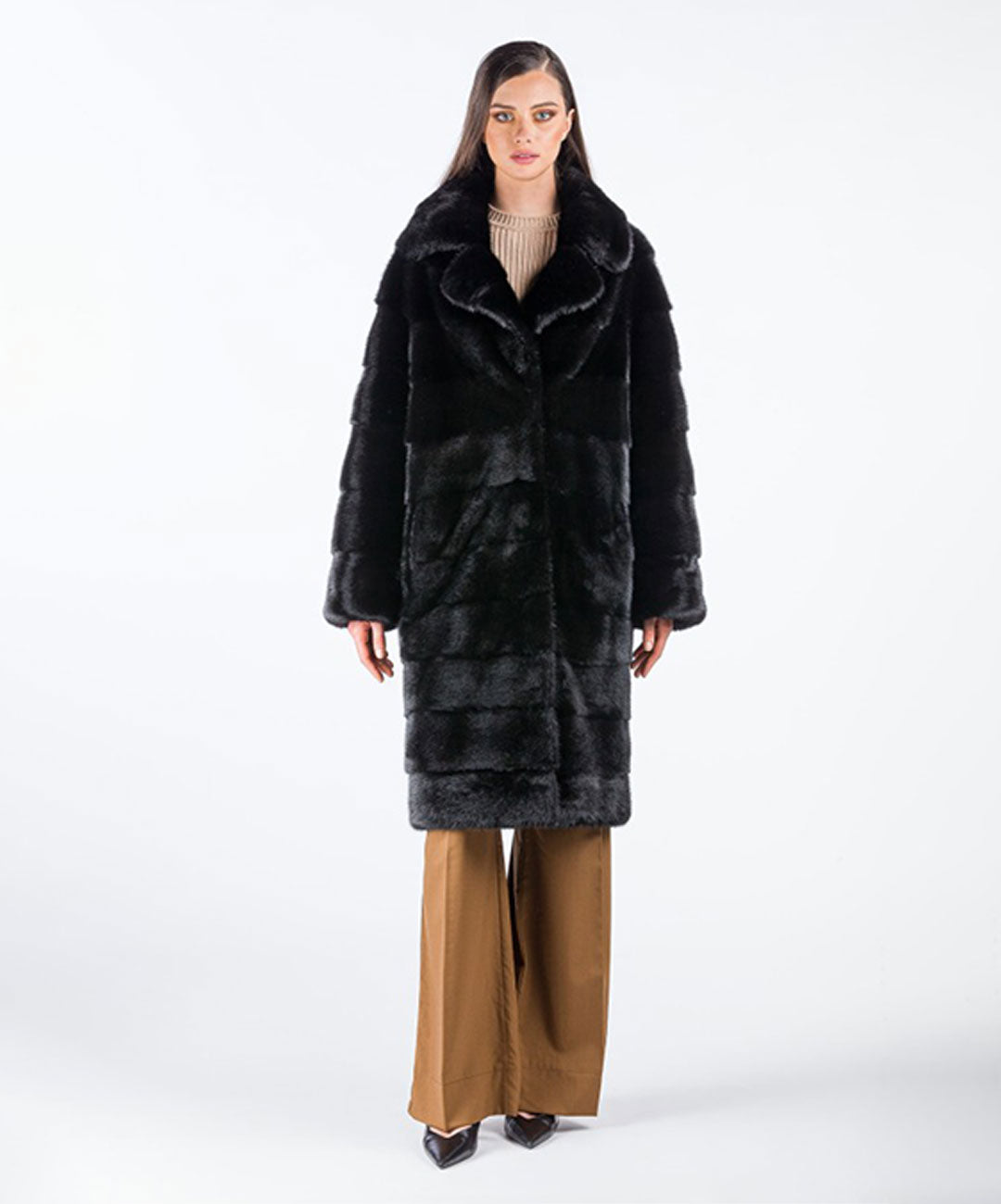 Betreten Sie das Reich zeitloser Eleganz mit unserem schwarzen Midi-Nerzmantel für Damen.