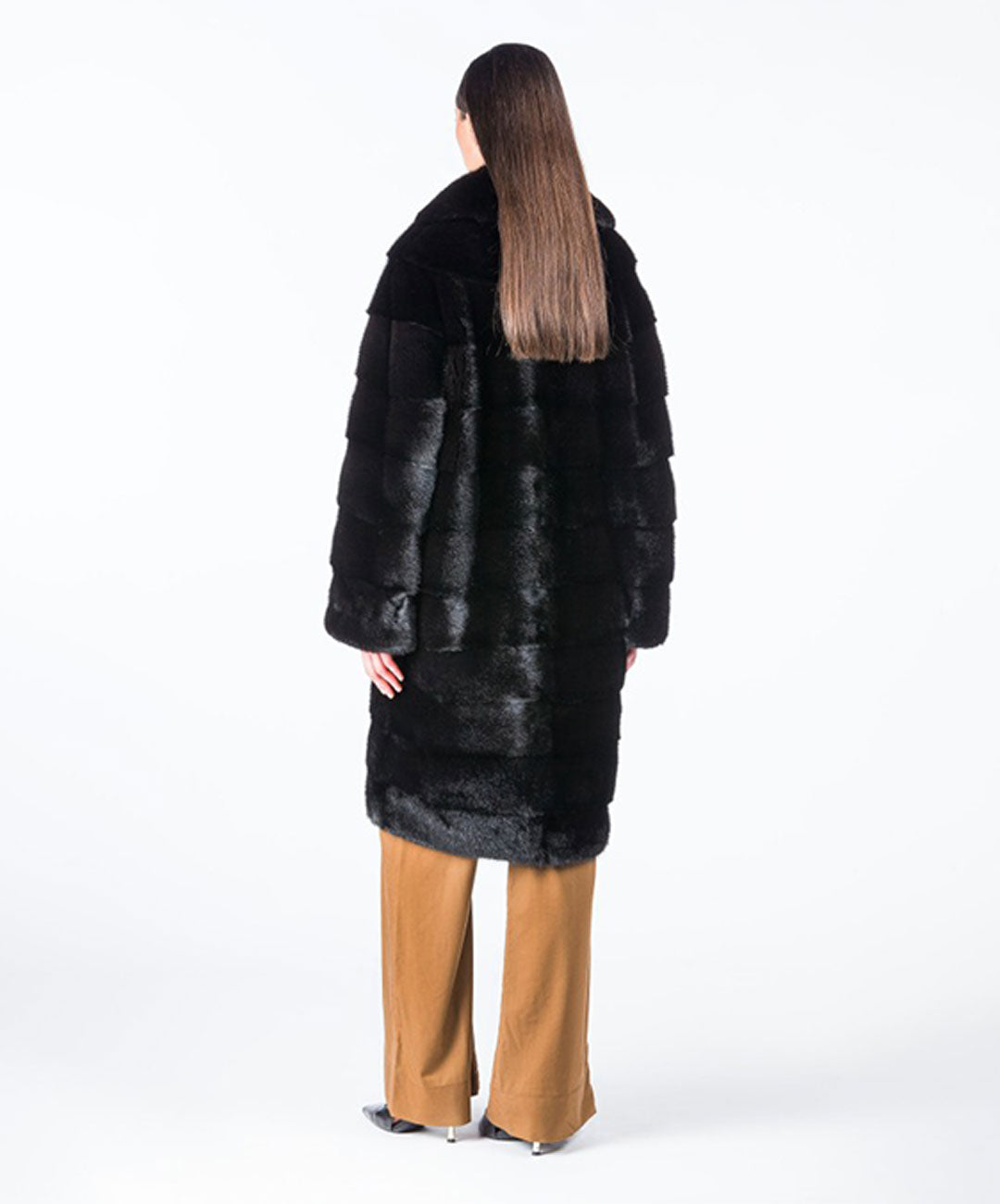 Dieser mittellange Mantel ist eine Hommage an klassischen Luxus und hüllt Sie in die üppige Weichheit von schwarzem Nerzfell. Das schlichte, minimalistische Design sorgt für eine vielseitige und raffinierte Ergänzung Ihrer Wintergarderobe und setzt mit jedem Schritt ein Statement.