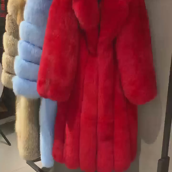 Make a dramatic entrance with the Full Length Fox Fur Coat. Crafted from the finest fox fur, this coat offers unmatched warmth and luxurious volume from top to hem. Its elegant, flowing silhouette creates a bold, sophisticated statement for any occasion.