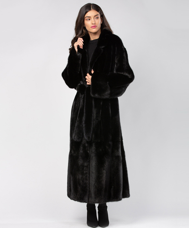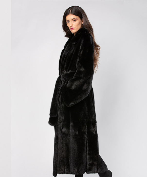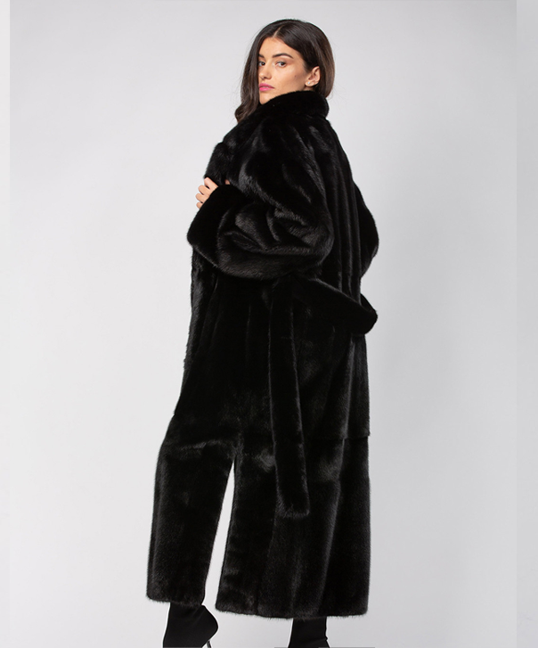 This elegant coat features the deep, rich tones of black mink fur in a flattering robed silhouette. Perfect for evening events or casual sophistication, it combines comfort and style effortlessly.