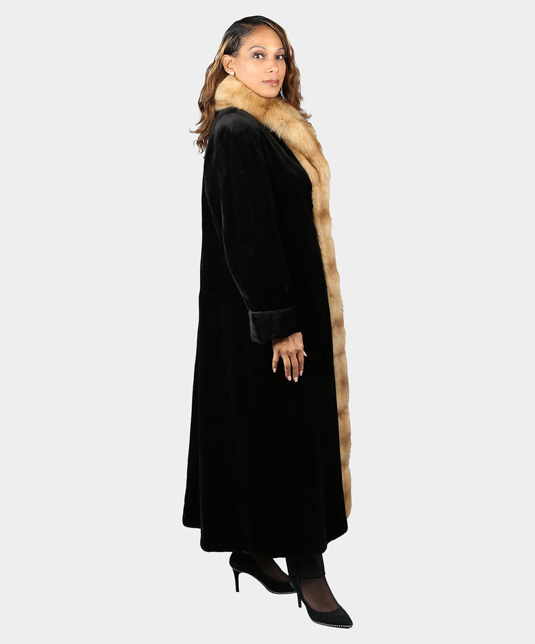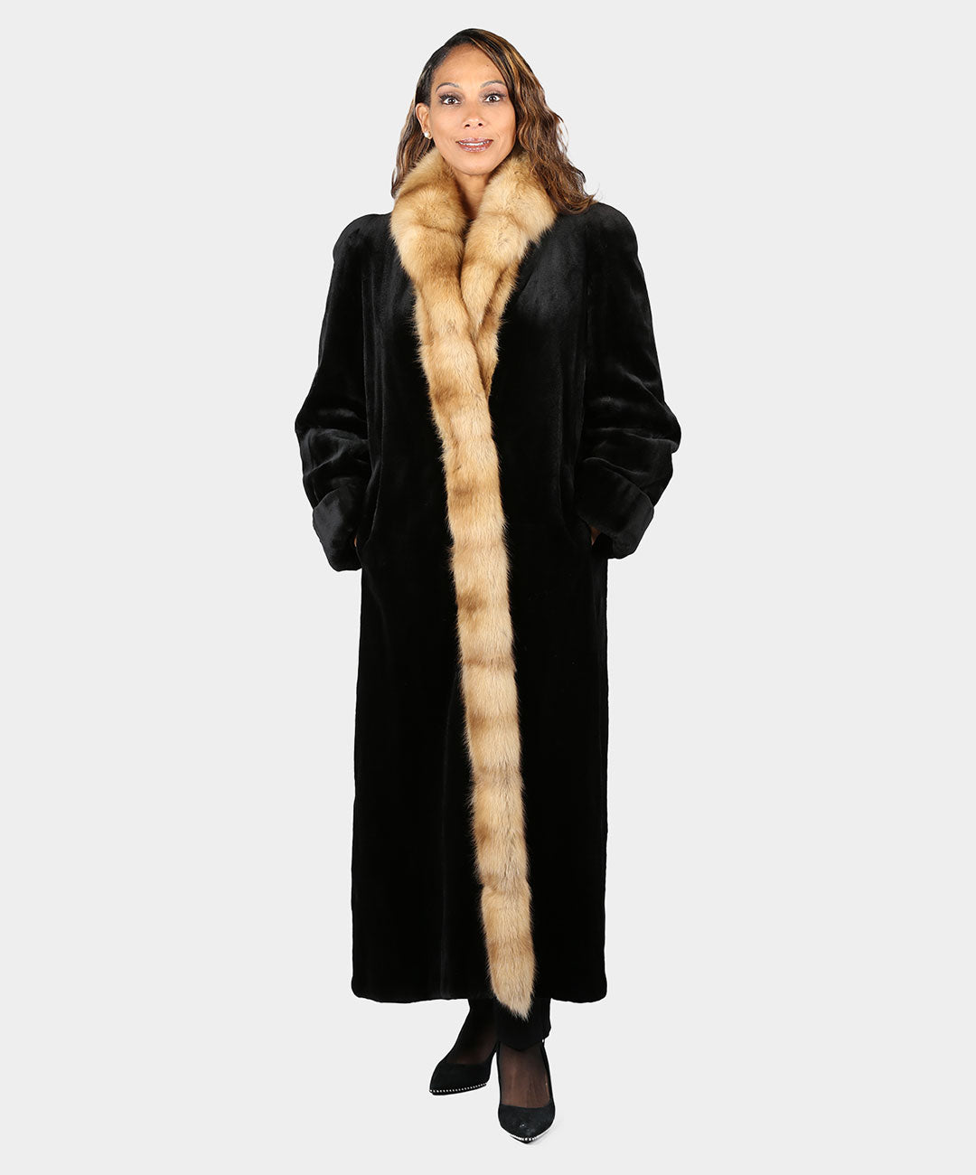 Erleben Sie den Inbegriff von Opulenz in unserem schwarzen Damenmantel aus geschorenem Nerz mit kreuzgeschnittenem Kragen aus goldenem Fuchs und Smoking-Front. Dieser Mantel ist eine Hommage an Raffinesse, bei der der kreuzgeschnittene Kragen aus goldenem Zobel auf den zeitlosen Reiz von geschorenem Nerz trifft und ein Stück schafft, das Opulenz und Charme ausstrahlt.