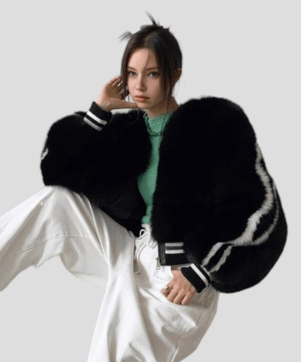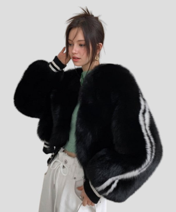 Diese Jacke aus luxuriösem schwarzem Fuchspelz weist auffällige weiße Streifen an den Ärmeln auf, die einen faszinierenden Kontrast bilden, der ihr elegantes, modernes Design unterstreicht. Das plüschige Fell sorgt für überragende Weichheit und Wärme, während die Bomber-Silhouette die perfekte Balance aus kantigem Stil und zeitloser Eleganz bietet. Mit akribischer Liebe zum Detail und einem ausdrucksstarken Design verbindet diese Jacke nahtlos Mode und Komfort und ist damit ein herausragendes Stück für die Saison.