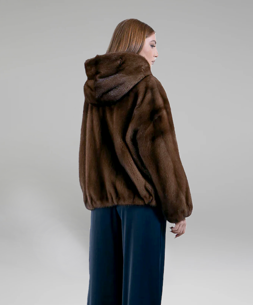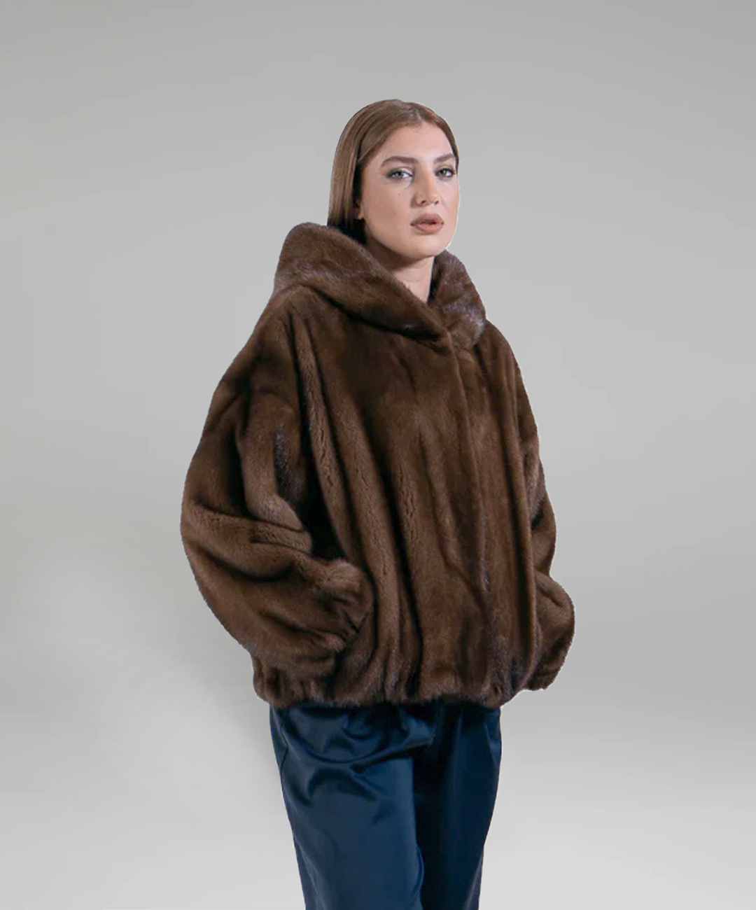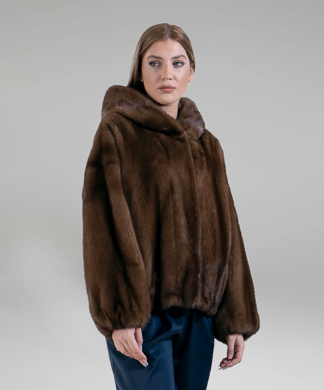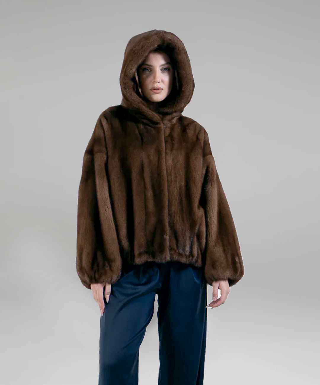 Entdecken Sie zeitlosen Luxus mit der Damenjacke aus braunem Nerz mit Kapuze.