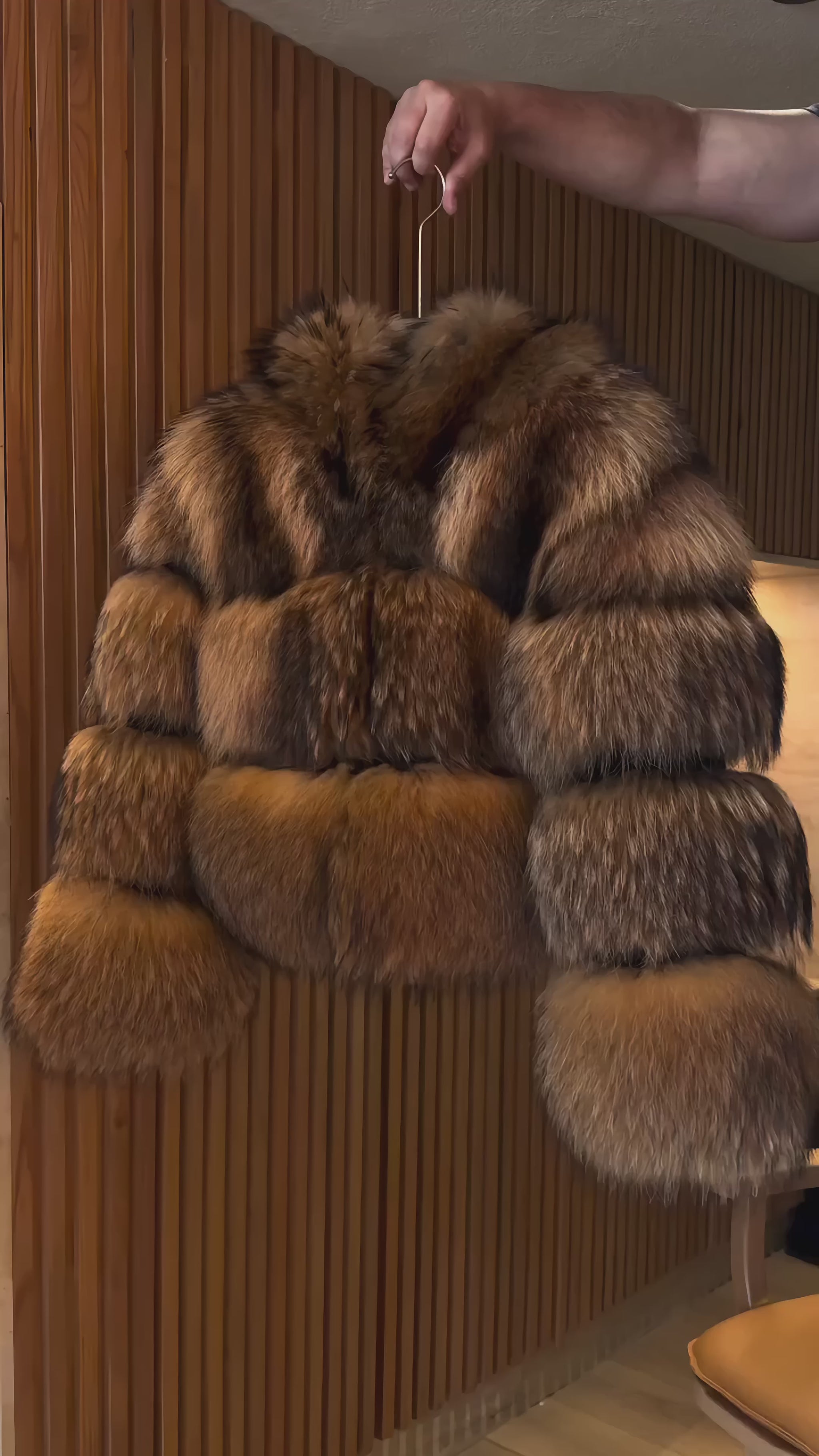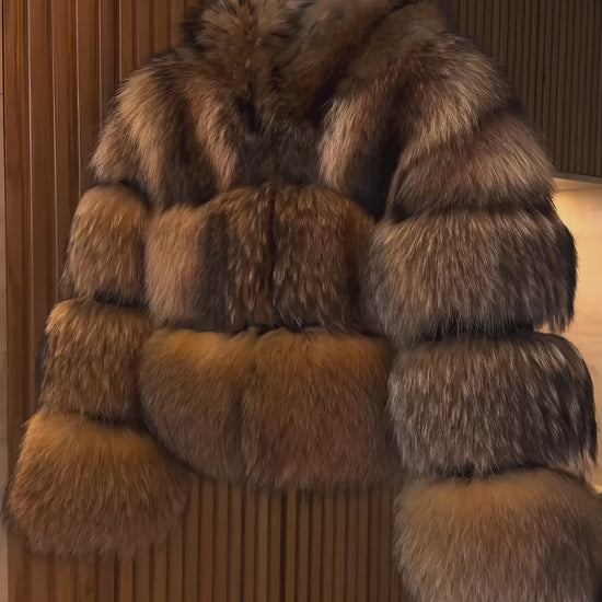Crafted from sumptuous raccoon fur, its plush texture and cropped silhouette offer both warmth and modern sophistication. The hood adds a chic, contemporary touch, making this jacket a versatile statement piece perfect for layering over any outfit with effortless style.