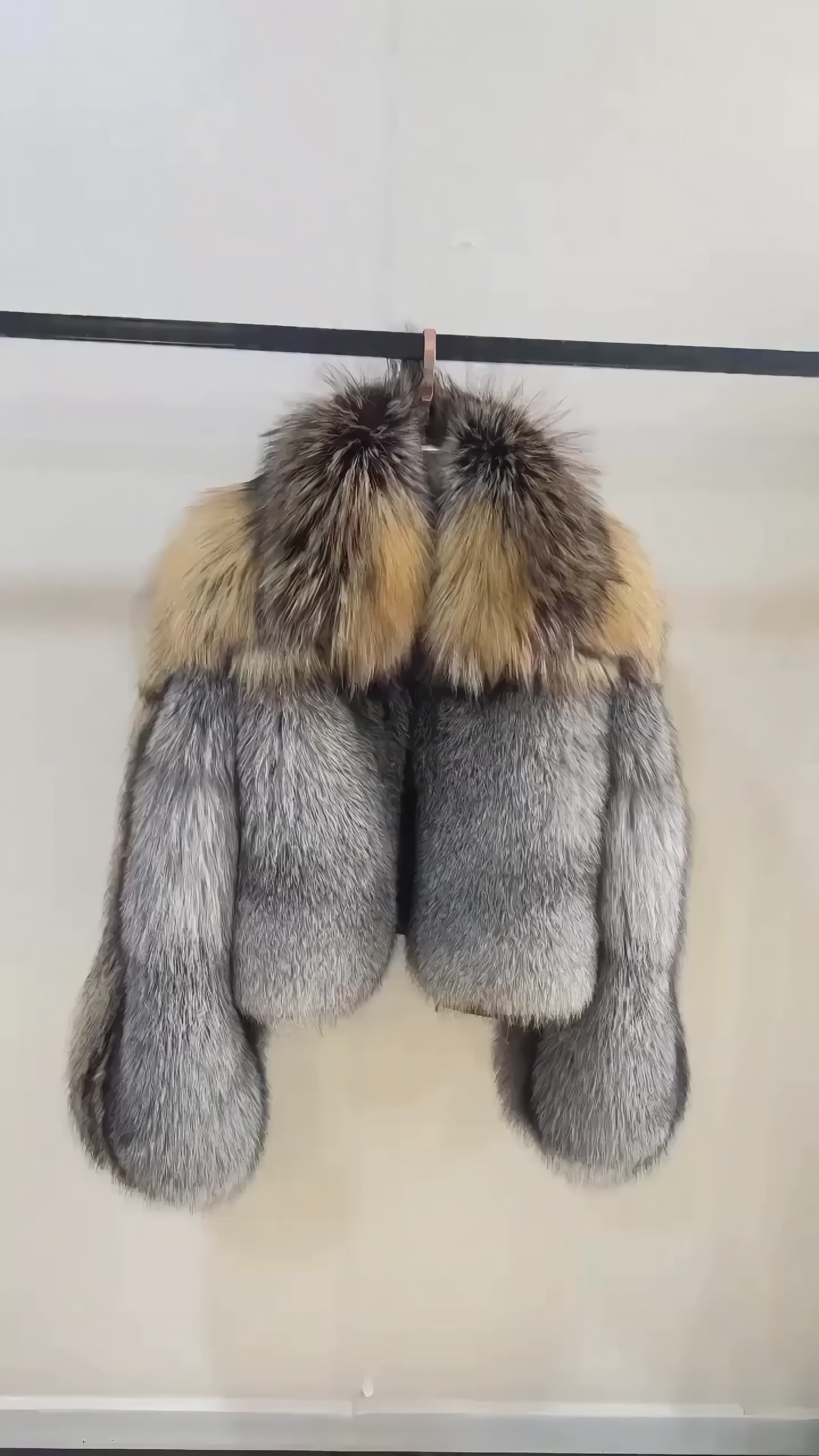 The Selene Coat captures the essence of natural elegance with its premium Cross Fox fur, showcasing rich, multidimensional hues of charcoal, silver, and amber.