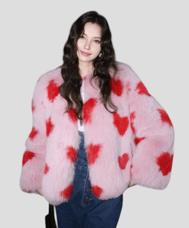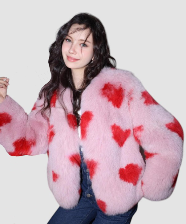 Add a touch of charm to your winter wardrobe with the Pink & ‘Red Hearts’ dyed Fox Fur Jacket.