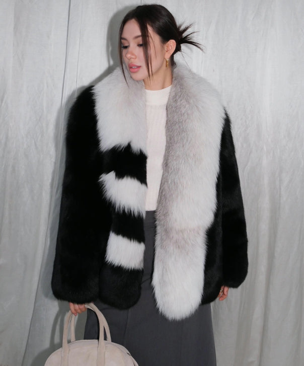 This one-of-a-kind design features a bold contrast of alternating black and white fox fur panels on one side, perfectly balanced by the soft, luxurious blue fox fur on the other. The asymmetrical pattern adds a modern touch to this timeless piece, blending striking visual appeal with ultimate warmth and comfort. Crafted with precision and attention to detail, the Winter Noir Fox Fur Coat is a statement in elegance and contemporary style.